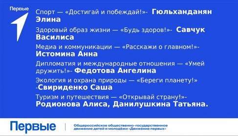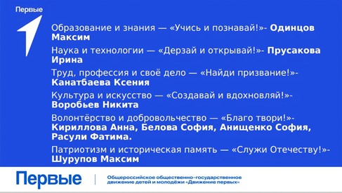 Совет Первых — это команда самых активных и инициативных ребят, каждый из которых отвечает за одно из 12 ключевых направлений деятельности Движения. Именно они будут генерировать идеи, организовывать события и воплощать в жизнь самые крутые проекты для всей школы!